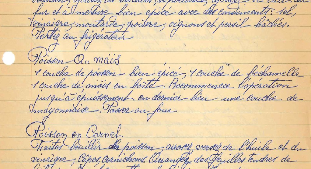 Tonight’s recipe is Poisson au Mais, or fish with corn. Here is the very basic recipe as my grandmother wrote it: