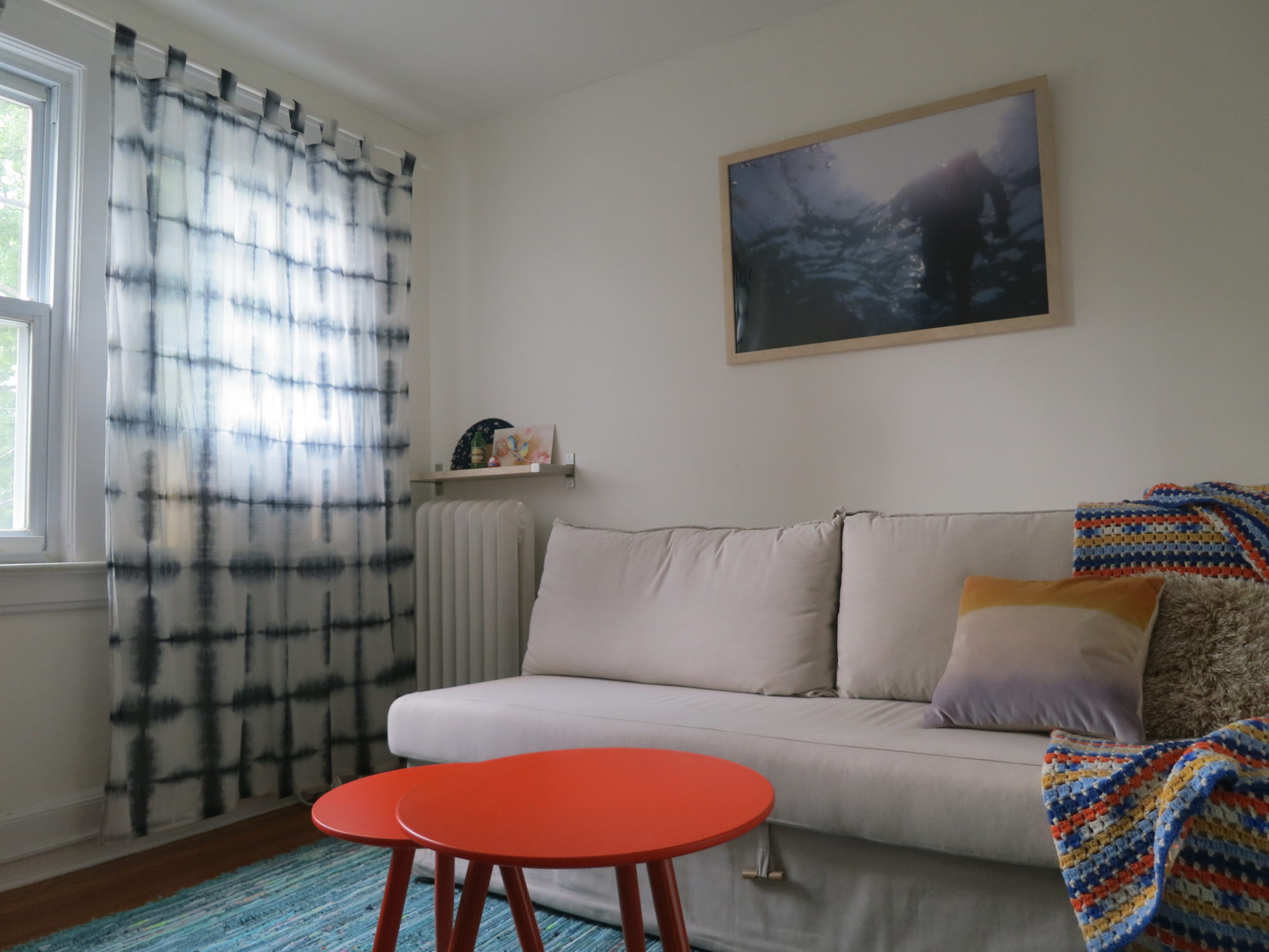 Next were the curtains, which I found on sale at Urban Outfitters online. The lightweight, semi-sheer material and shibori pattern have both a bohemian and a beachy feel, in my opinion. They don’t block the sunlight too much and I like that the blue doesn’t match exactly with the rug.