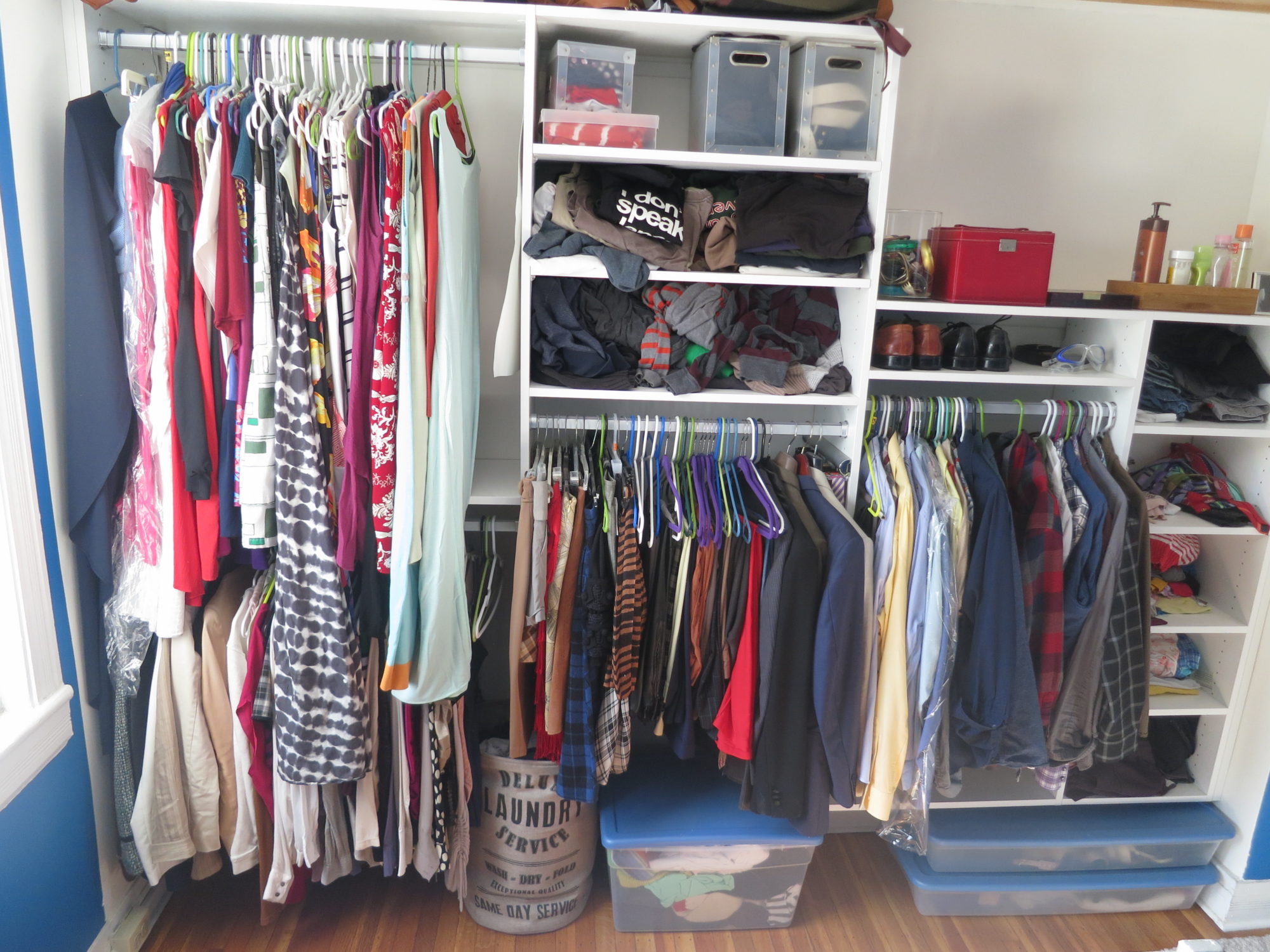 As this isn’t an ad for them, I won’t go into all the details, but I’ll say it was an easy process and, because we weren’t doing anything difficult, they were able to build us a custom closet within a few weeks of our initial meeting. As you can see, we got a closet with several hanging sections and several areas to put folded clothes. Because most of Daniel’s clothes are folded and his clothes take up almost the entire dresser, most of the closet is for me.