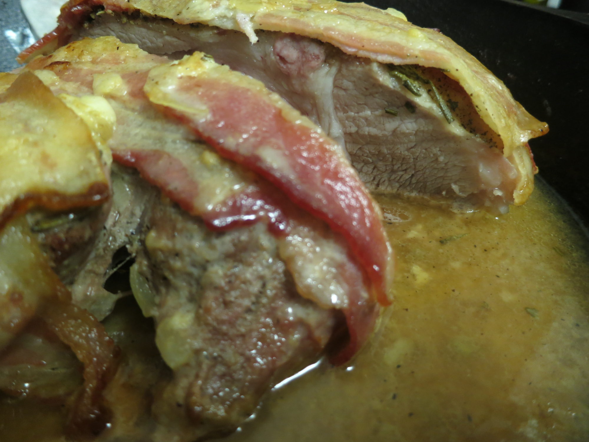 - When the bacon has browned, spoon bechamel sauce over the entire piece of meat and continue cooking the pork in the oven.