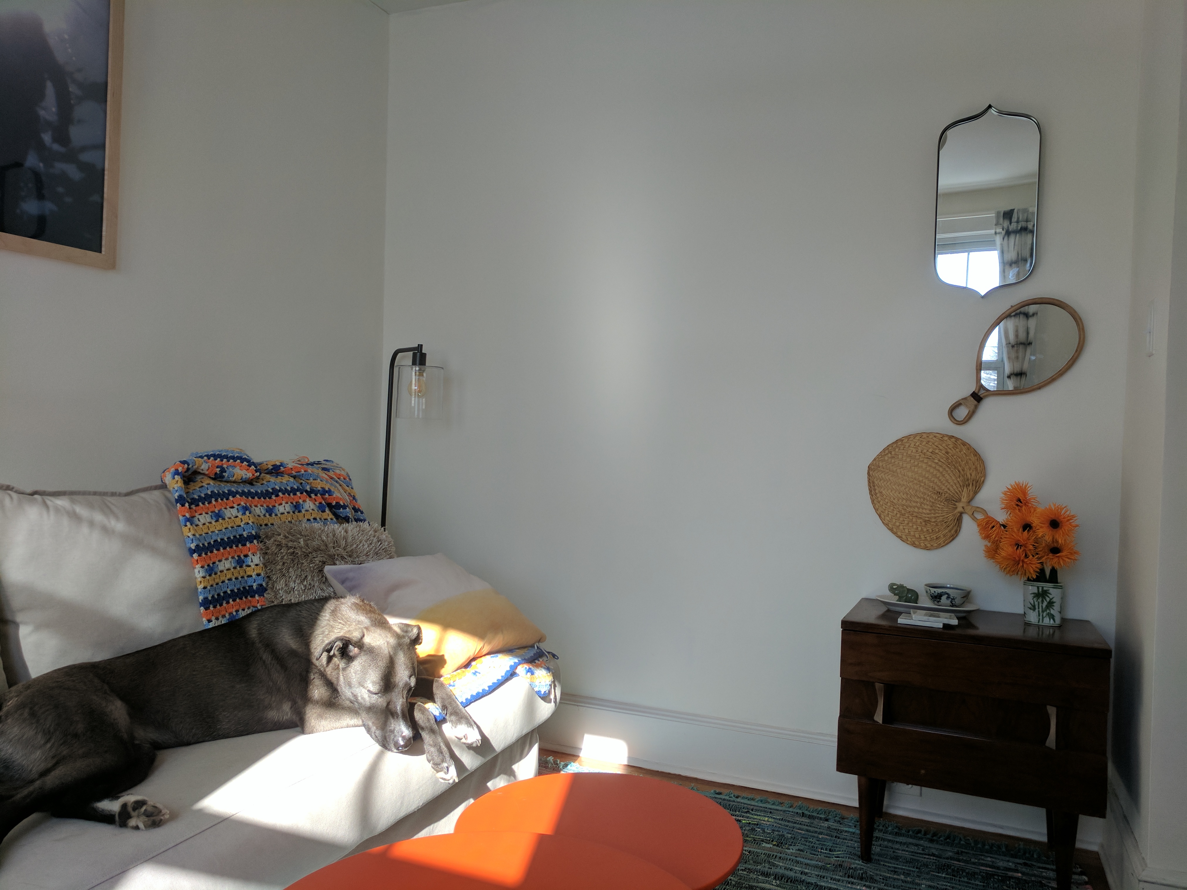 - I wanted to add a mirror but a mirror with curves since I didn’t want there to be yet another square or rectangular shape in the room (between the long shelf in the corner, the long couch, the long rug, the rectangular piece of art and the nightstand, there were a lot of long horizontal lines).