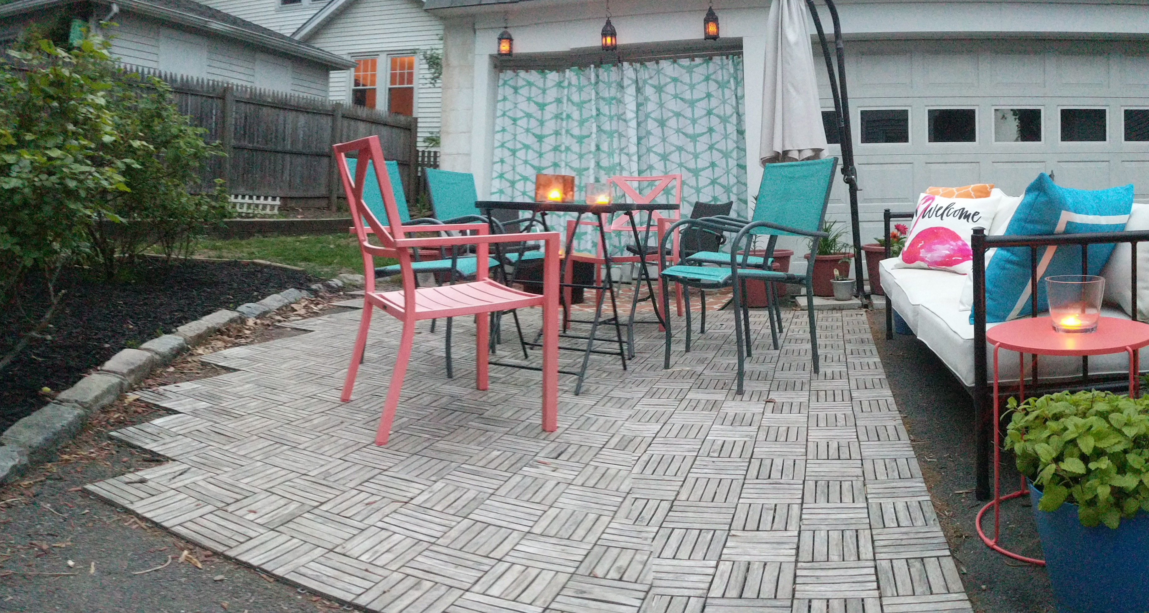 In my opinion, the best way to start creating a space is to first determine how you plan to use it and then determine the look and feel you want for it. If you have room to create zones, that’s a good way to help you determine the use, look and feel. We wanted to create a patio area that had both a dining “room” and living “room” for us but as well as to accommodate multiple guests for entertaining. We wanted bright colors that evoked being on the sea, which turned into a lot of turquoise and blues, corals and oranges. We furnished the space with patio flooring from Ikea, a rug from Amazon, a wooden bench from Domino, and then the rest from Target: tables and chairs, pots that I spray painted, and an umbrella.
