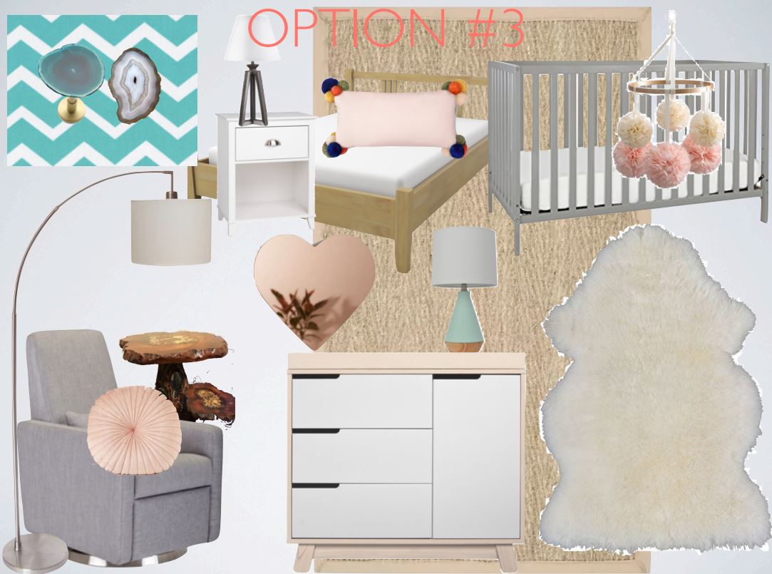 In the meantime, I suggested the elephant mobile and crescent mirror in other options would help make it feel more youthful, if she wanted to swap those in.