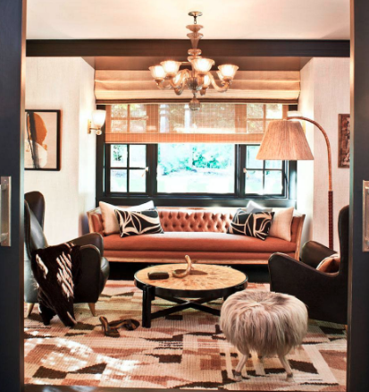 In this room designed by Kelly Wearstler, you’ll notice a lot of what we talked about already. Similar colors and tones (warm browns and pink, black and white/cream), varying scale (pattern on pillows is similar but not the same size as the pattern on the throw blanket and the scale of the pattern on the rug is different from both), broken up by solids (the couch, chairs, stool, lamp and shades), and now, of course, the magic number of three (rug, pillows, blanket). You’ll notice how the patterns of the pillows, blanket and rug make your eye move around the room.
