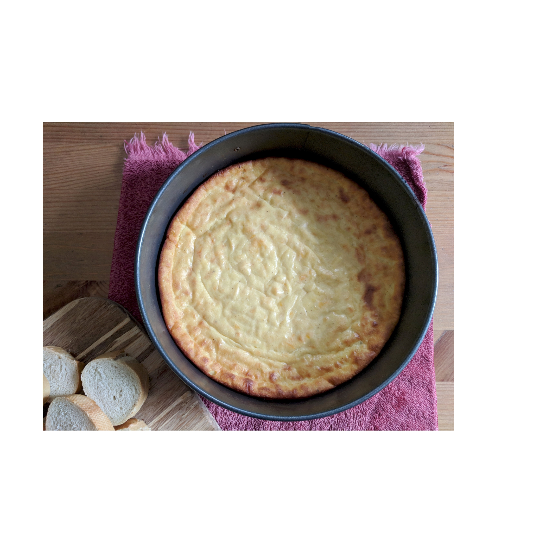 After about 30 minutes of baking, I sliced up a baguette and laid the slices out on a cookie sheet to toast in the oven while the souffle cooked. The souffle wasn’t done until about 35-40 minutes of baking.