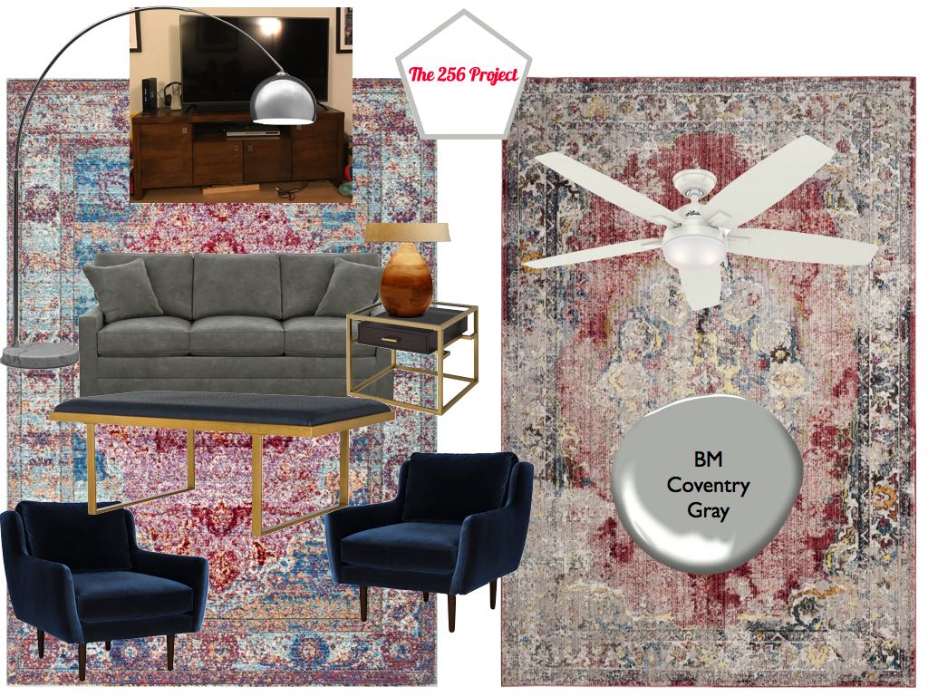 The #GiveMeLibertyandaGreatCouch clients like pops of color and patterns, leans toward white/gray and gold for neutral colors, and likes modern with classic and traditional elements. Because they have a dog and young son, they want fun, functional and unfussy design, as in no furniture or decor that they will fret about being dirty or slightly broken or scratched. More details on the design they are looking for are in my first post.