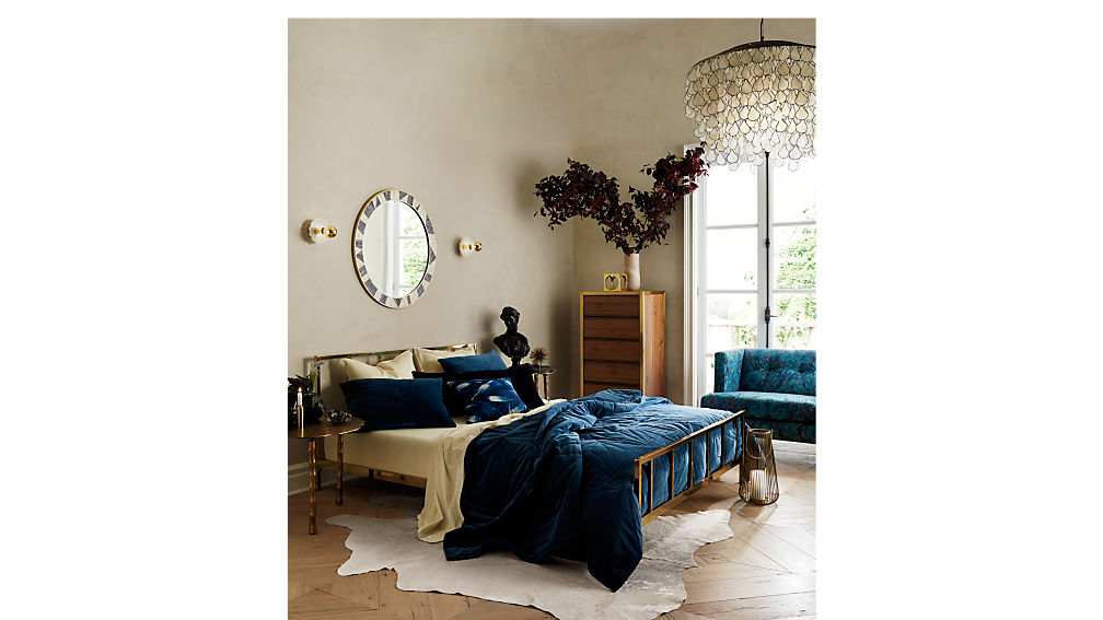 Right now, the room is very dark and masculine, with lots of emphasis on dark wood furniture, all of which is enveloped in a dark blue paint color. I’d like to lighten things up where I can and switch up the materials. The closet doors will likely be wood if we ever get around to doing that renovation, which means we need to explore other material options for the bed as that takes up a lot of visual space in the room.