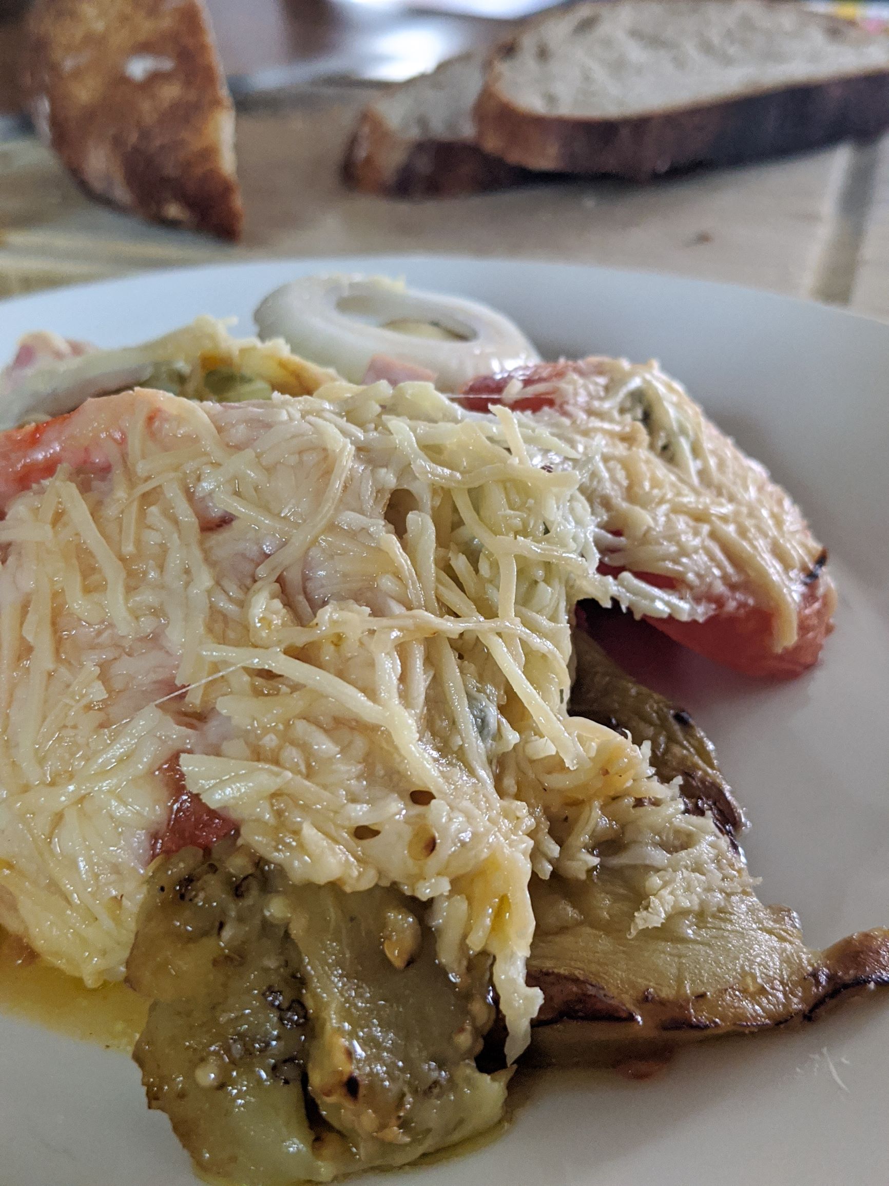 - Put it all in the oven (I put it in on 350 degrees F for 40 minutes but it would have been better at 400 degrees F for 20 minutes to get a browner cheese topping and crispier onions.)