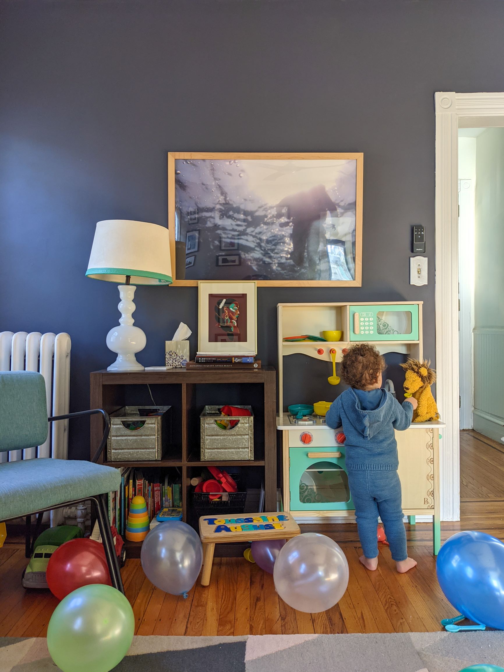 So now instead of two IKEA bookshelves side by side to act as a sort of book and toy credenza, we have one and then the play kitchen next to it. The other bookshelf is upstairs in the office (more on that coming soon). We’ve been shoving additional toys and trucks under the chair in the corner but I think, to help keep chaos at bay, I’ll start hiding more toys in the garage and swapping them in and out more frequently.