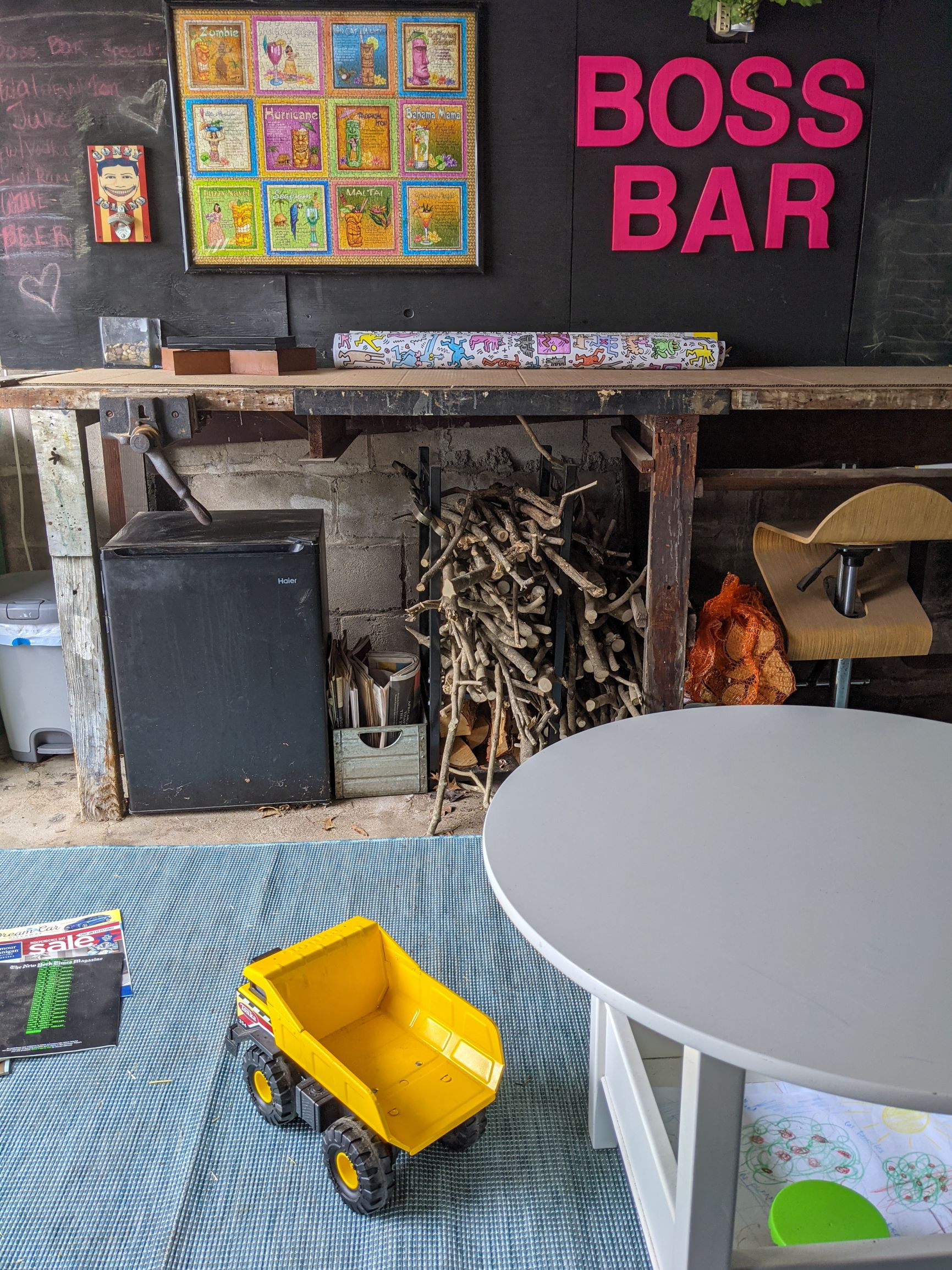 Wouldn’t it be funny if this mini fridge used to be filled with cold beers but now it’s filled with cold juice boxes? In a classic case of trying to make something out of nothing, I have turned Boss Bar in our garage – where the goal was to have more hang out space for adults – into a play space for kids because always trying to make magic for Gus is practically all I do now.