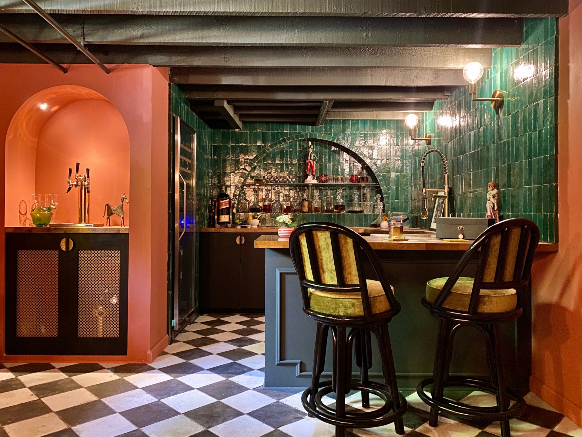 A. I think if I could name one element that defines all of my spaces, it would be that mix of vintage and modern. And, to be honest, my strategy for each space looks a bit different, but the one thing I would say is I LOVE mixing eras. I think that’s what keeps a room on its toes, and prevents it from being too predictable and falling flat. For this speakeasy, I was dedicated to infusing the space with art deco vibes and used plenty of authentic vintage art deco, but balanced that by bringing in modern-day art deco pieces, and even some fun mid-century pieces that played well with the undulating art deco shapes. For example, the marble table tops are mid-century and very typical mid-century in their prominently-veined marble tops, but the scalloped edging paired so perfectly with the art deco bases I placed them on. In other spaces, the color palette does more of the dictating. For example, I am currently working on a refresh of my library space, and I will be bringing pieces together from different eras that all play nicely with my pink and green color palette.