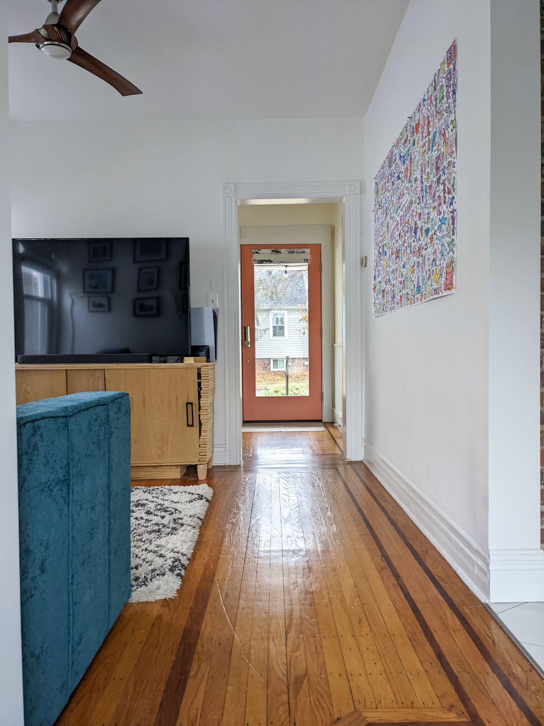 This post is all about the TV room, which is now the middle room. We needed to find a sofa that would be comfortable to watch TV and movies on, look good against the colors of our kitchen since the sofa is visible from the kitchen, as well as fit in with what we already had. We already had an off-white and black shag rug that I love, the white oak TV console I built, as well as a mid-century modern style coffee table. And we also recently added some fun lighting, which you can read about here.