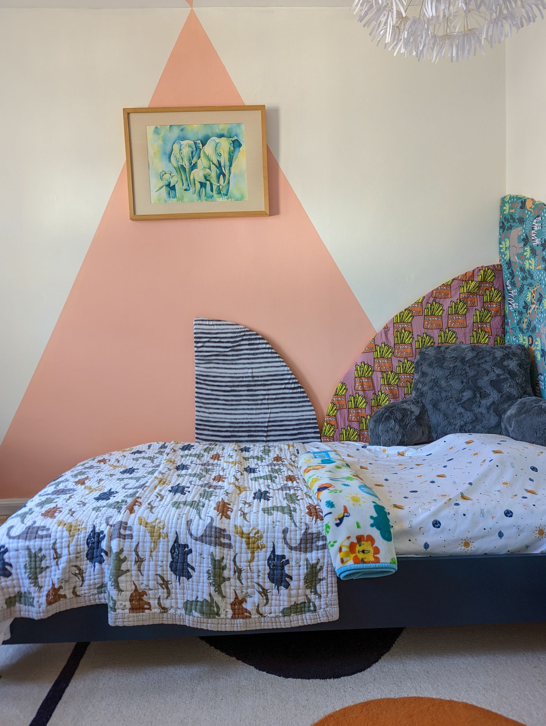 And now for the upholstered headboard. I really loved his crib sheets and didn’t want to get rid of them. Unfortunately, they don’t come in twin bed size so it was either part with them forever or find a way to use them. And so I did!: