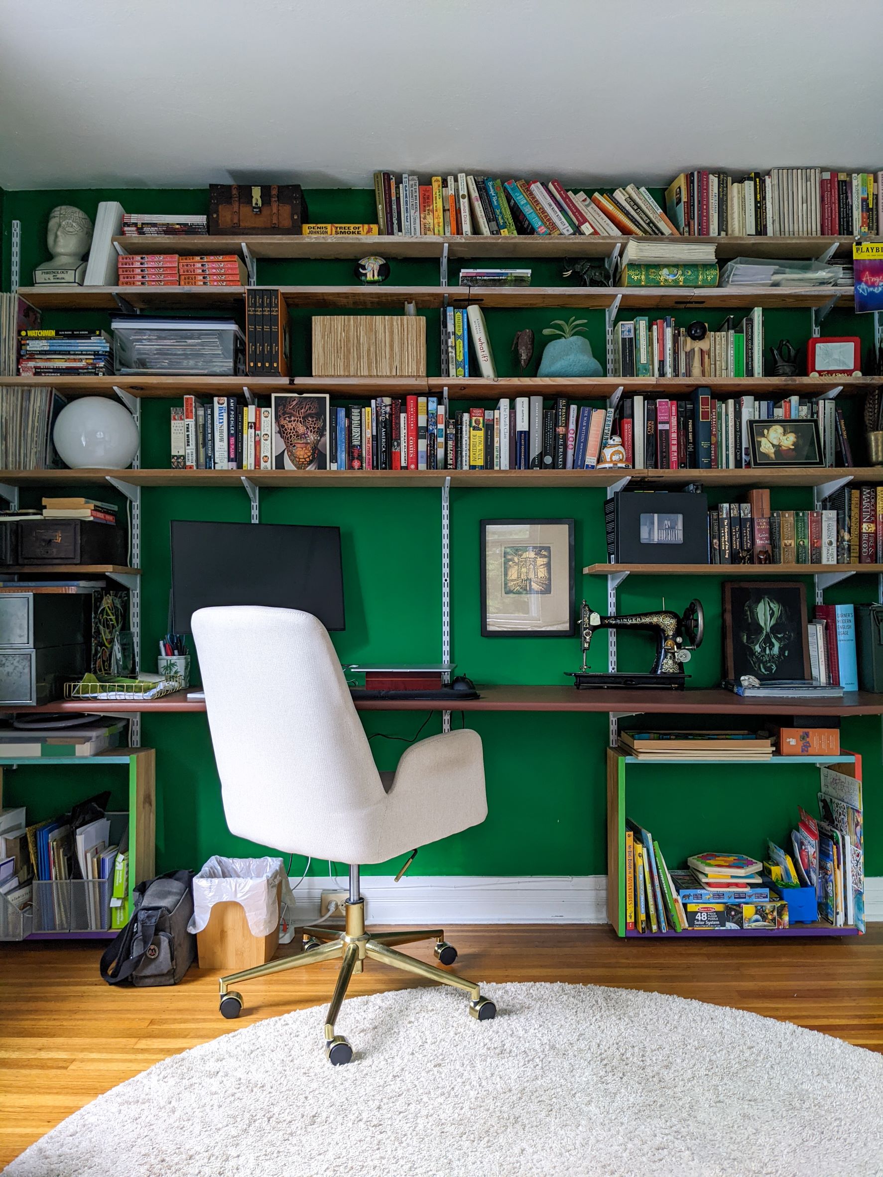 And now, thanks to this DIY bookshelf and desk project, we have a new home office! The room feels a little more spacious and overall looks more cohesive since it’s not just a hodgepodge of old Ikea shelves and a desk.