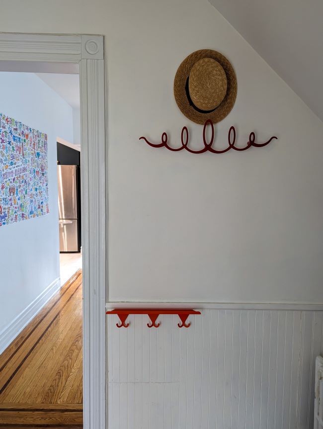 We made an entryway with happiness in mind when we moved in, with a neon green mailbox and a bright red squiggly coat rack as two eye catching elements. And while we’ve made changes to our entryway in the time we have lived here (see here and here), we now needed to make the entryway a tad more kid-friendly and I thought of a simple solution. So what did we do?