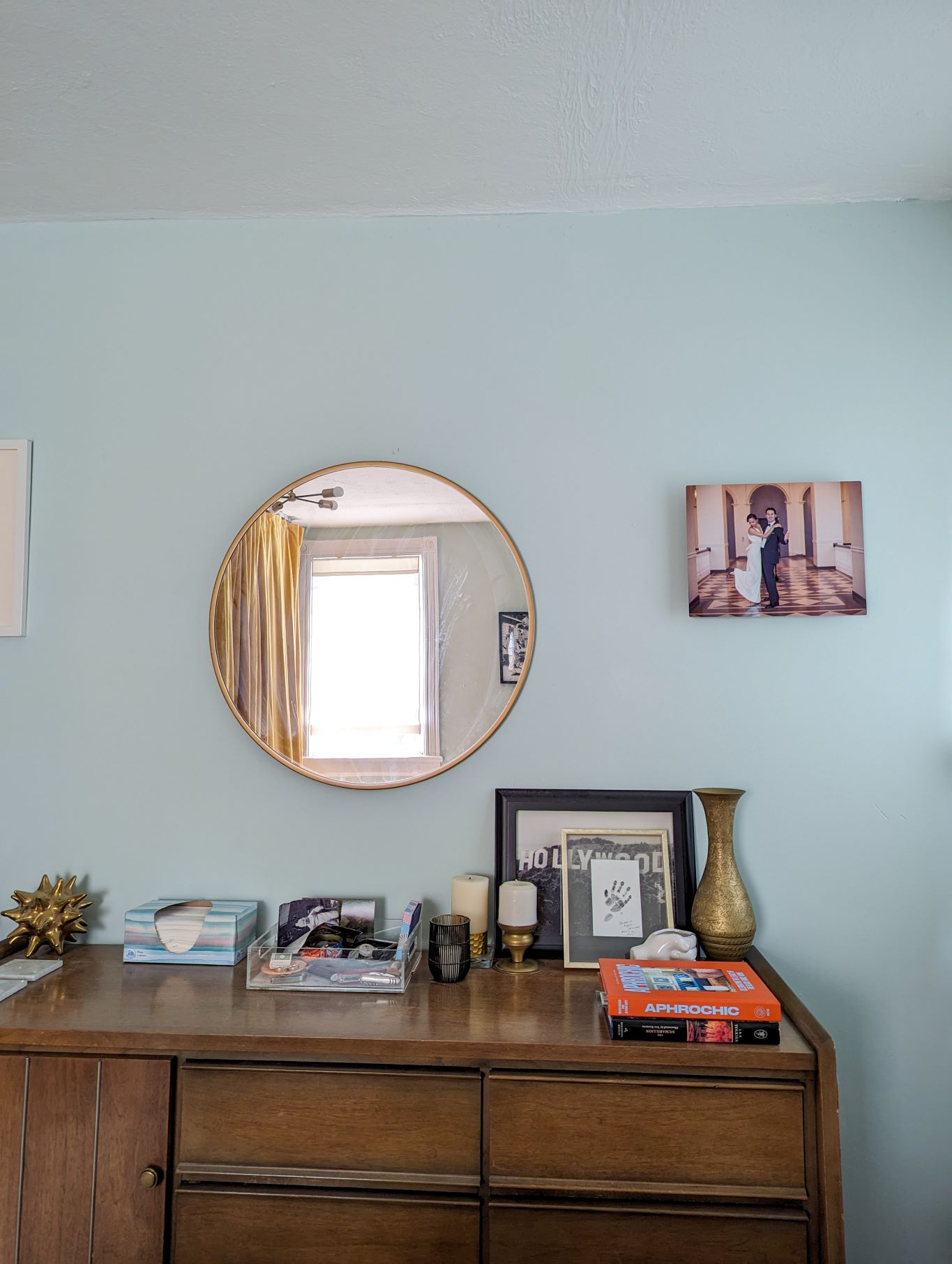 Now we have a light green primary bedroom that feels bright and airy rather than weighed down, accentuated by metallics, and grounded by the neutrals or our new bedroom rug and the woods of our midcentury modern furniture.