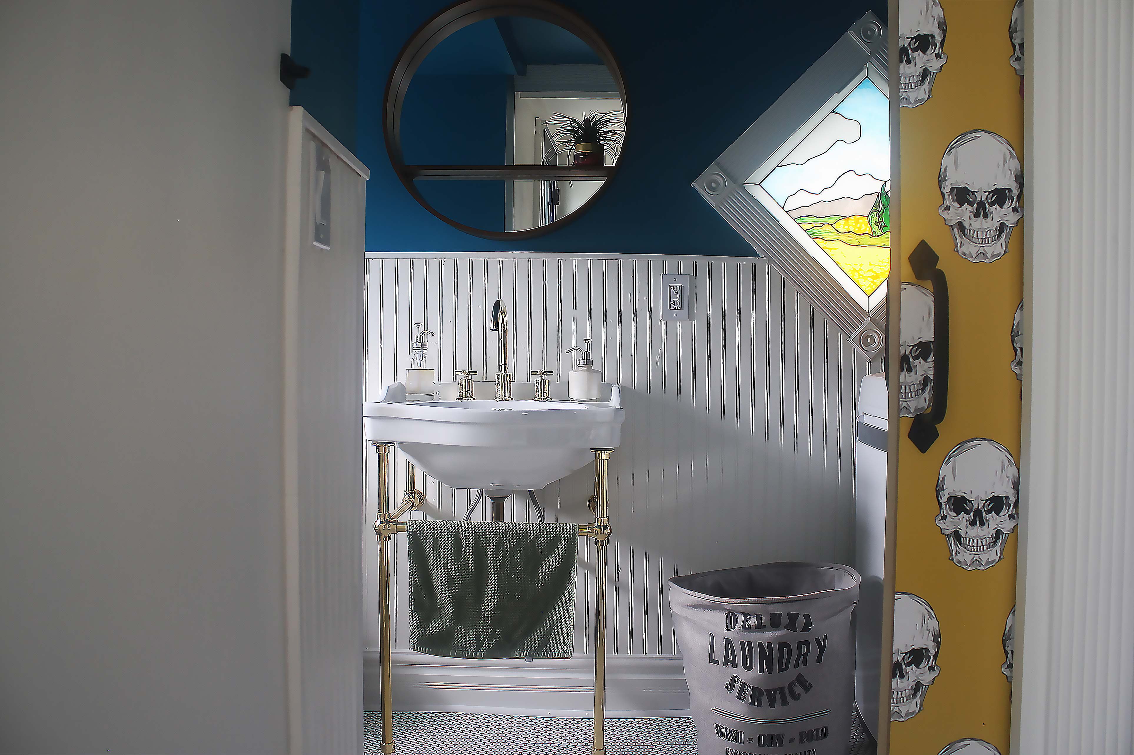 We decided to go a little classic with vintage details inside the beautility room and have a little more fun with the outside. The wallpaper of the skull blowing bubble gum remains one of my favorite decor decisions in The Cozy Cottage. We also replaced the back door as ours was falling apart – before painting it that triangle pattern in the photo above, I had to remove a layer of veneer that was falling apart due to years of water damage. We chose a full glass door to let in natural light.