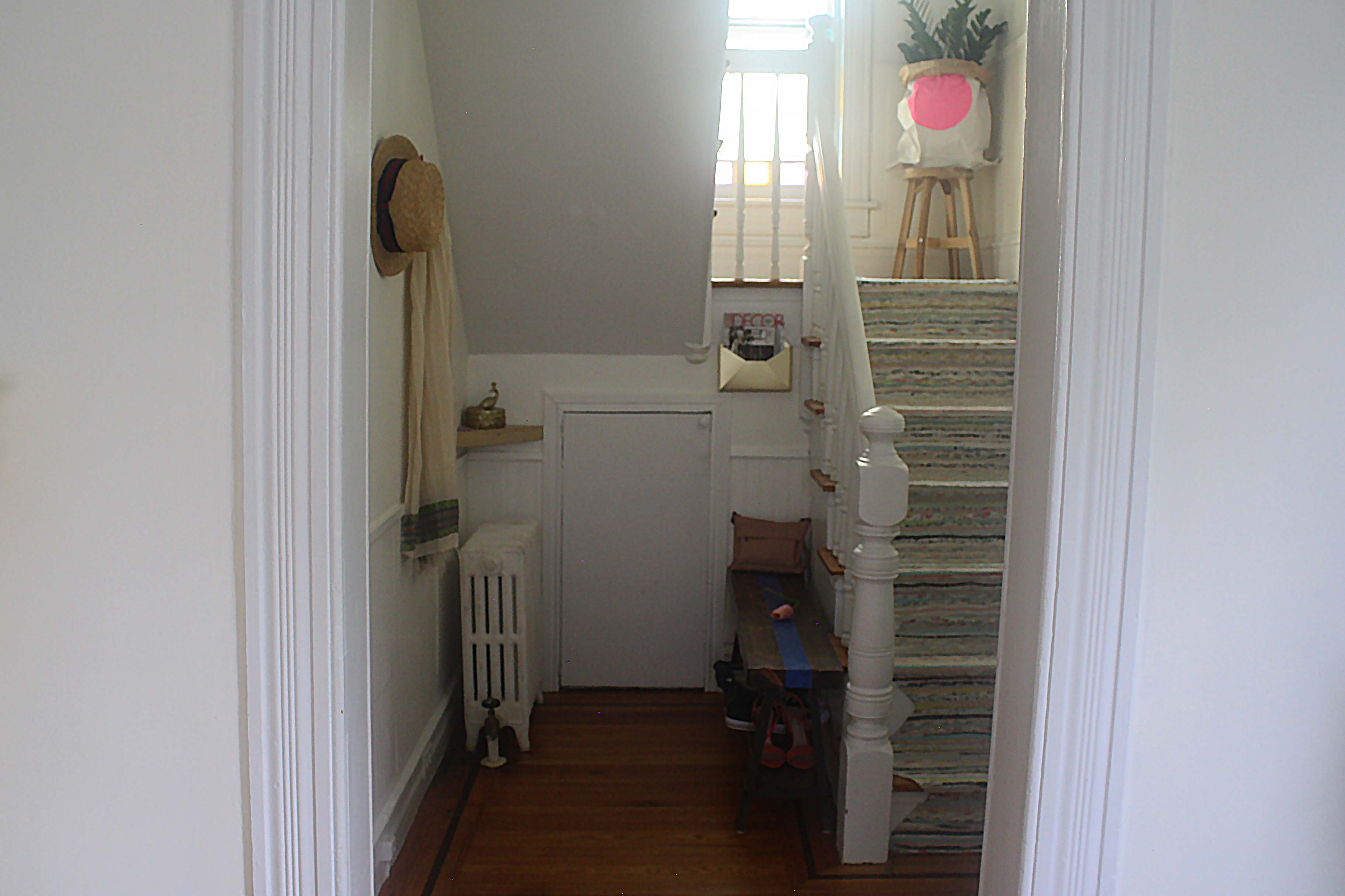 Over six weeks, I added beadboard to all the walls in the entryway, the stairs and the upstairs landing, painted everything white so really take advantage of the natural light and the pretty colors the stained glass windows cast on the walls, hired an electrician to replace the entryway light fixture, designed and printed a wallpaper to cover in the interior side of our front door, semi-made a runner to cover the stairs and added artwork.