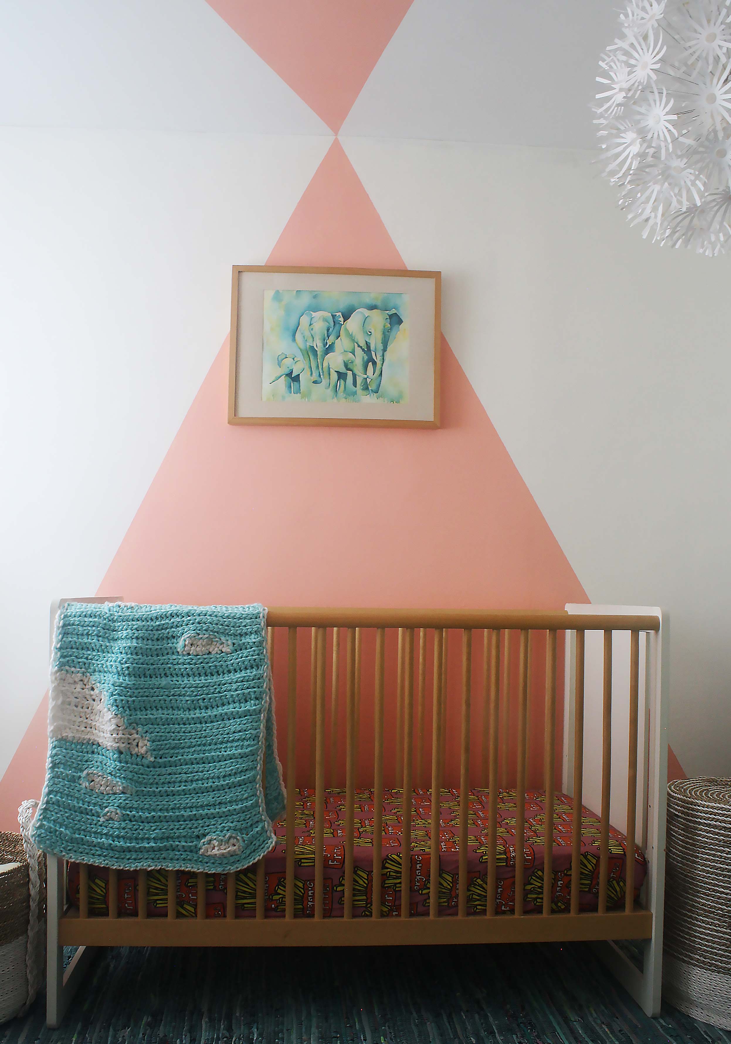 I thought a bright and light coral would be a nice gender-neutral color for the nursery that would be fun to transition to a toddler bedroom. I went with Salmon Peach by Benjamin Moore and painted a large triangle to frame the crib as a feature wall, then continued the triangular shapes on the ceiling across the room to the other side.