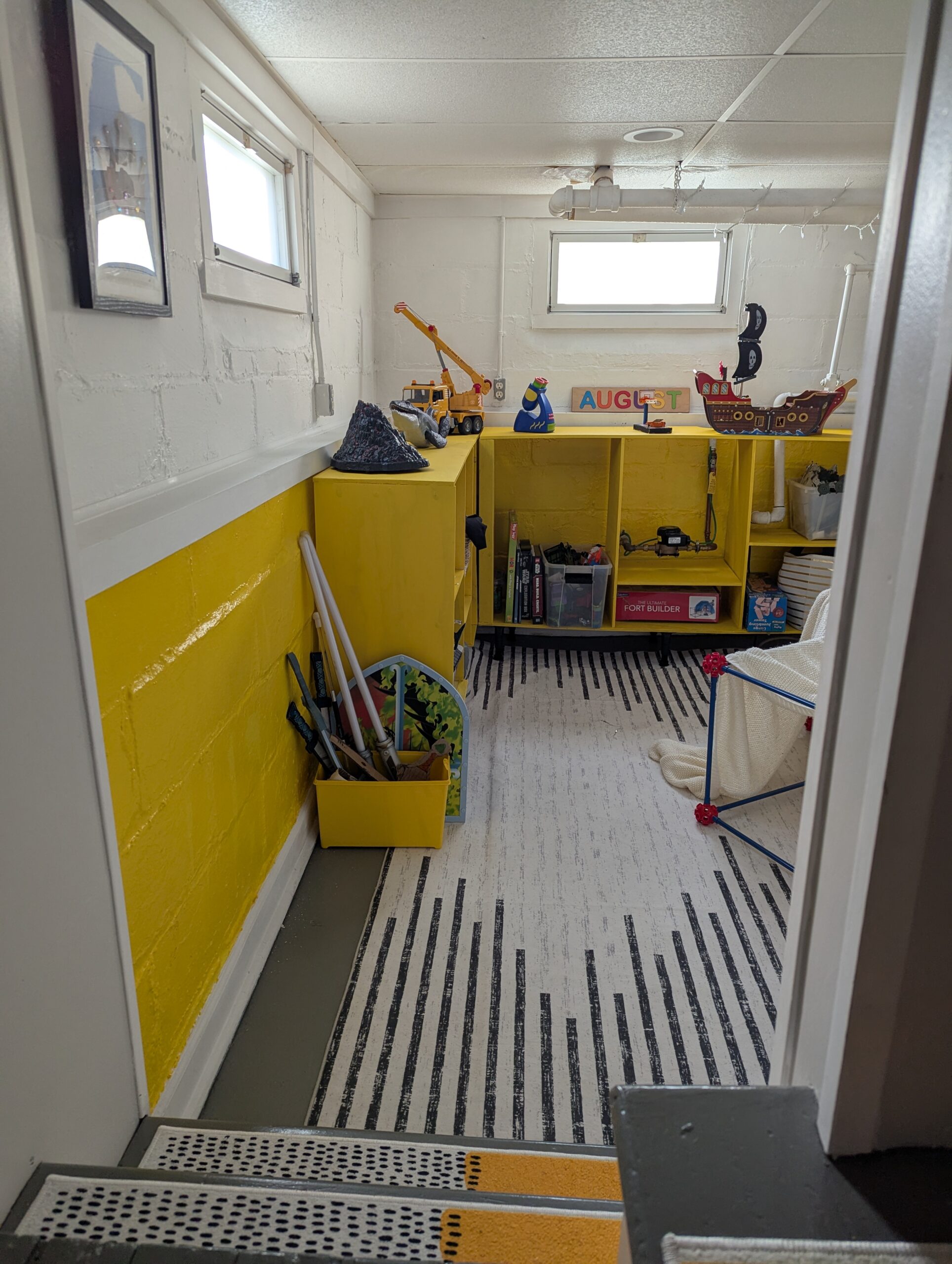The basement was originally painted stark white—clean, but not playful. I wanted a burst of fun, so I painted both the shelving units and the lower half of the walls a bright, cheerful yellow. Painting the shelves and the wall behind them the same color helps frame the playroom and makes the space feel clearly defined from the rest of the basement.
