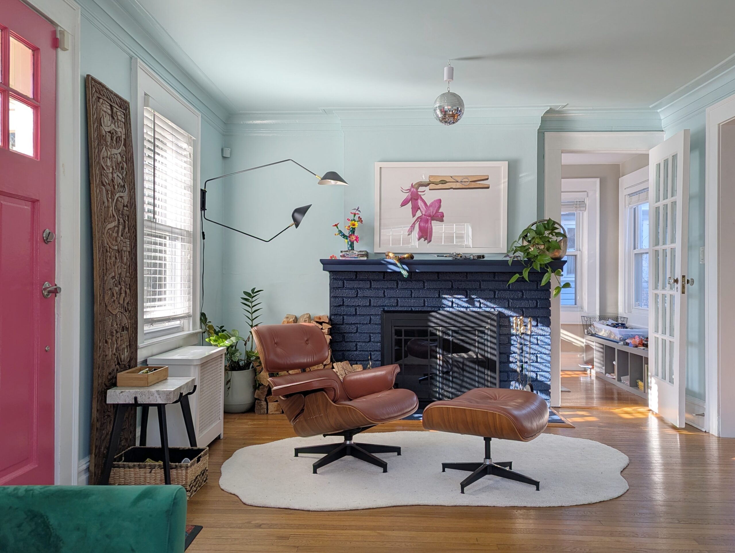 When we moved in, the living room was painted entirely greige, with the ceiling, trim and fireplace painted white. While neutral spaces can be beautiful, they didn’t reflect our style. We’re known for our love of color, personality and quirky design touches. Because the living room is the first room you see when entering the house, I wanted it to set the tone immediately.
