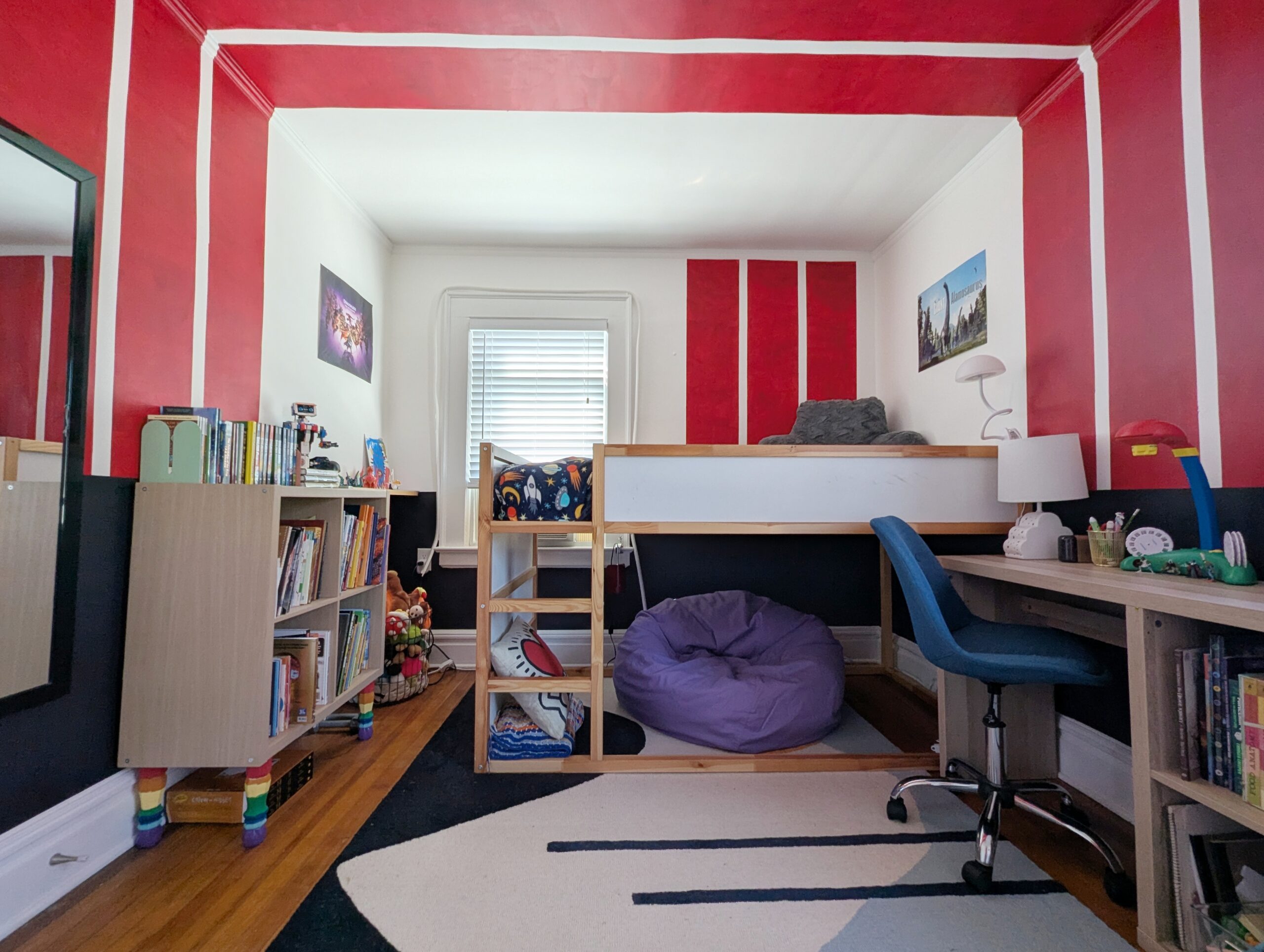 Designing a kids bedroom makeover around black, red, and stripes felt bold and drastic for a space meant for sleep, so I negotiated adding white to balance the palette. After a few weeks of planning, I landed on a design that felt playful, graphic, and surprisingly balanced.